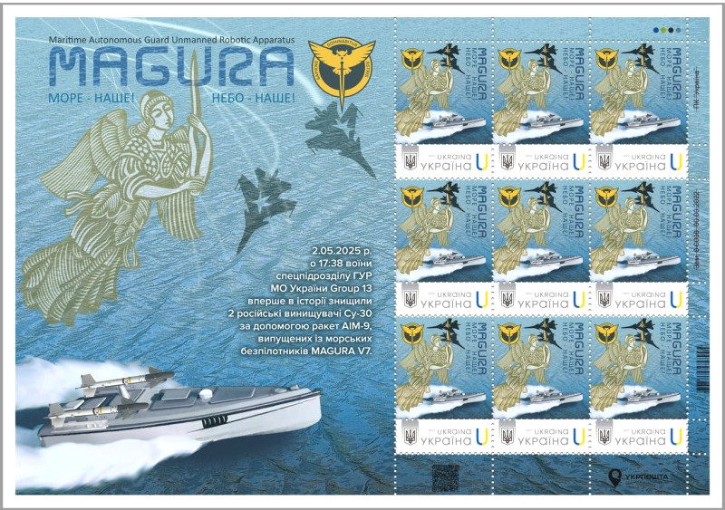 Компанія "Укрпошта" анонсувала випуск марки "MAGURA. Небо наше. Море наше" в пам'ять про успішне знищення двох ворожих винищувачів Су-30 за допомогою українських морських безпілотників.