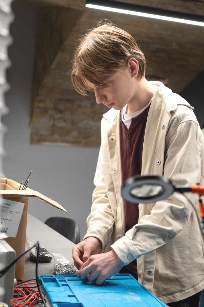 Студенти академії, разом з колегами з Українського католицького університету, навчаються створювати FPV-дрони з нуля: від монтажу до програмування і тестування готових моделей. Заняття проходять у сучасній лабораторії, оснащеній 3D-принтерами та електронікою.