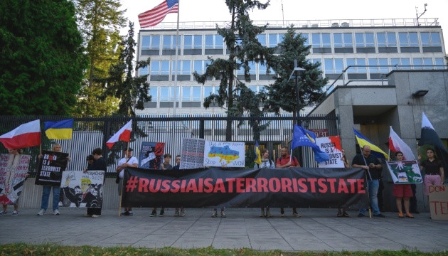 Як повідомляють організатори, учасники акції зібралися, щоб подякувати США за їхню підтримку та закликати не дозволяти "мирні" рішення, які можуть закріпити наслідки агресії.