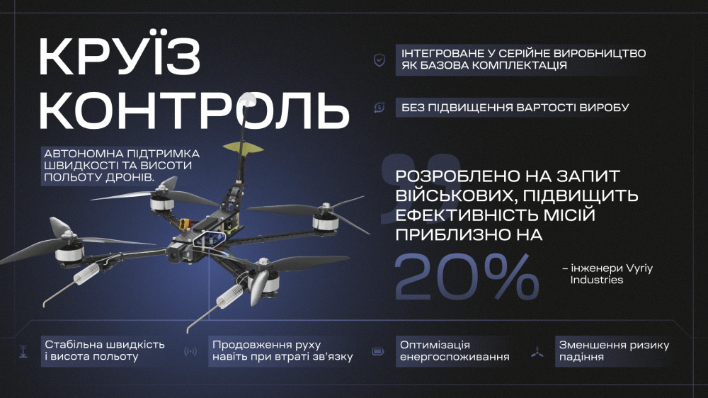 Компанія VYRIY з України представила нову функцію "круїз-контроль" для своїх серійних дронів, що є важливим програмним рішенням. Ця інновація покращує стійкість безпілотників до впливу РЕБ і збільшує ймовірність успішного завершення місій навіть при короткочасній втраті управління. Як зазначено в прес-релізі компанії,