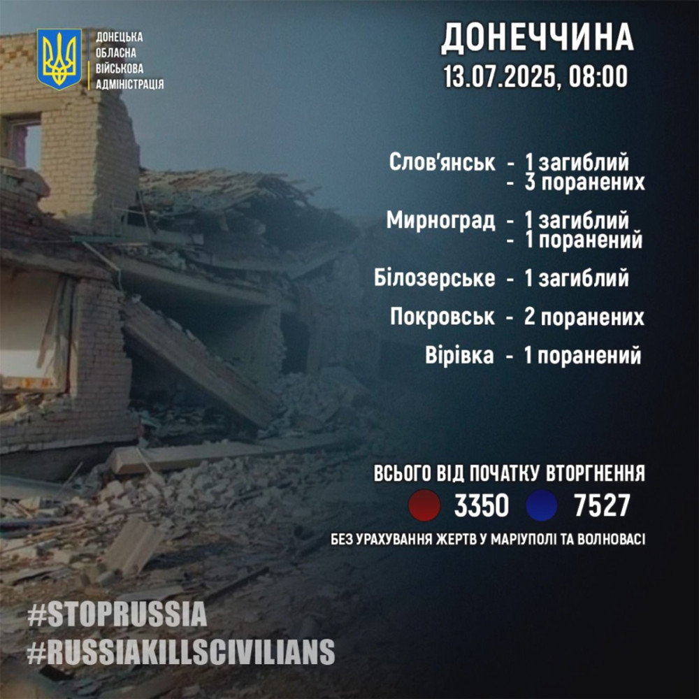 "12 липня російські сили забрали життя трьох громадян Донеччини в Слов'янську, Мирнограді та Білозерському. Ще сім осіб отримали травми за добу", - зазначено у повідомленні.